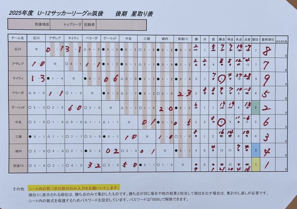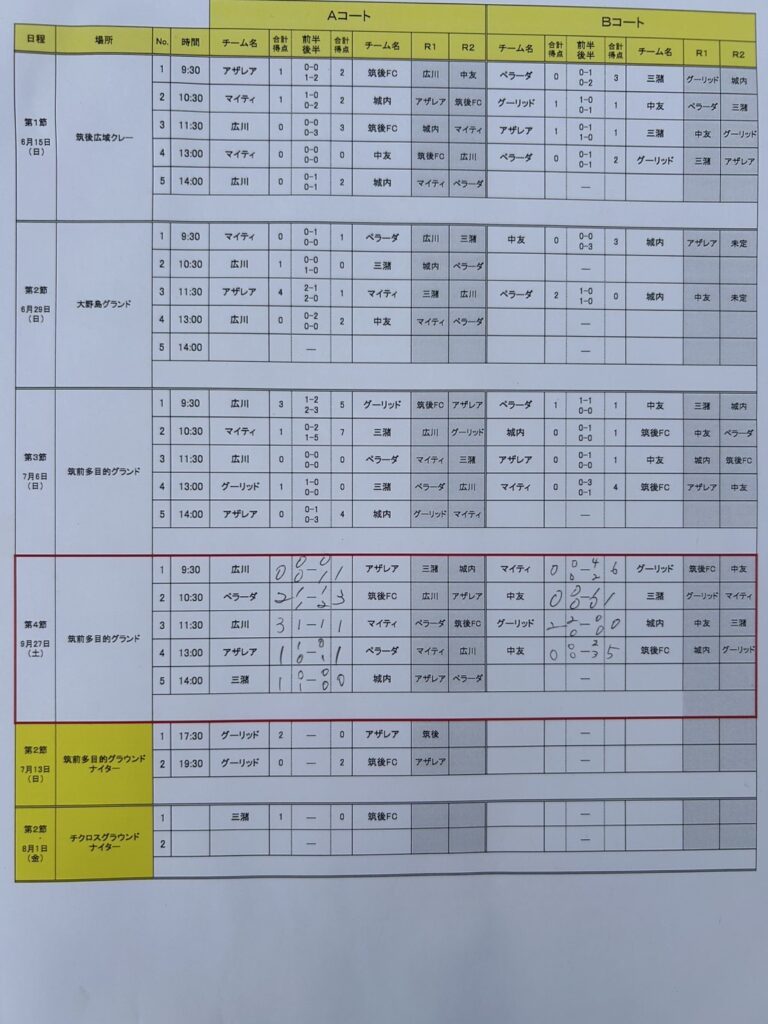 【U12結果】2025年度 U-12サッカーリーグin筑後 トップリーグ 〈後期 第4節〉2025.9.28(筑前町多目的運動公園)